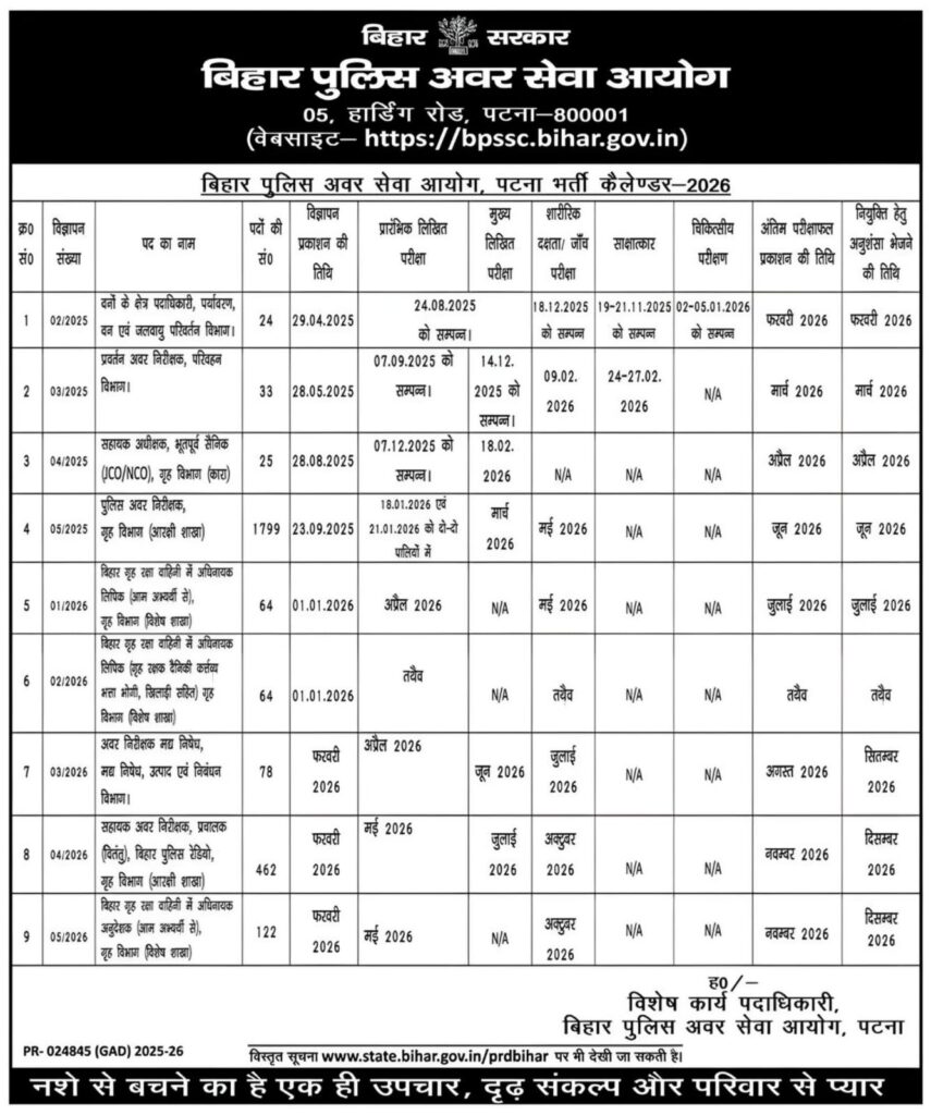 Short Information : बिहार पुलिस अवर सेवा आयोग (BPSSC) द्वारा वर्ष 2026 भर्ती कैलेंडर जारी कर दिया गया है। इस कैलेंडर में दरोगा (Sub Inspector) भर्ती सहित कई महत्वपूर्ण परीक्षाओं की संभावित तिथियां घोषित की गई हैं।